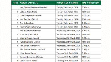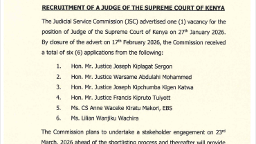 The Judicial Service Commission has revised the interview schedule for the position of Judge of the Environment and Land Court. 🗓️ The interviews will now be conducted from 24th March to 8th April 2026. Post Views: 0
